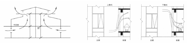 建筑单层外围护结构的开窗方式首先解决两个问题:一是对气流形成一定遮挡,减小原有风速;二是设置挡板及运用可控制开窗方式使进入室内空间的气流改变运动方向,减小行人高度的风速。满足这两个条件的可控制开窗方式有下悬及上悬两种模式, 为两种模式的开窗方式。下悬开窗方式的特点为气流从底部进入室内后向上方移动,减小对人坐立点高度的影响;上悬开窗方式的特点为气流进入室内后,窗户的开启使气流进入室内后向下部空间移