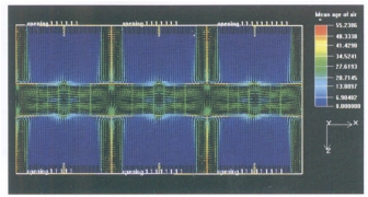 再从教室内侧的窗洞口处排出,风速逐渐加大,由于室内上层空气的运动,带动下层空气随之运动,从而达到改善整个空气品质的效果。在走廊上部排气口风速达到最大,在走廊下层由于上层空气快速流动,下层空气也随之形成了一个低速涡旋,改善走廊的通风效果,并且不会对内部的行人造成任何不适。通过上述模拟实验,我们对不同高度层面的空气速度场和空气龄分布状况进行了定量的直观模拟,对改造后的文远楼自然通风原理有了一个全面且更直观的认识。在室外温度适宜的春秋或者初夏